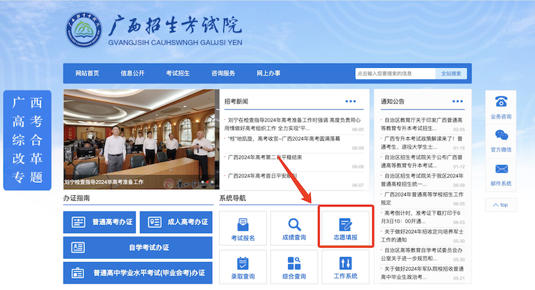 高考志愿填报期间,社会一些不法分子和中介机构可能利用考生和家长对志愿填报的关注,实施诈骗活动,请考生和家长提高警惕,认准官方信息渠道,确保个人信息和财产安全。6月10日起,广西高考志愿填报辅助系统(以下简称系统)上线,免费向考生提供高考志愿填报辅助服务。系统分PC端、移动端2种途径供考生选择使用,考生可从“广西招生考试院”网站—“志愿填报”—“广西高考志愿填报辅助系统”进入系统PC端;微信小程序搜索“广西高考志愿填报辅助系统”进入系统移动端。考生可将系统与我院编制的《2024年高考指南》《2024年高考指南招生计划篇》结合使用,更详细了解各招生院校相关信息,为正式填报志愿做好充分的准备。自治区招生考试院也将继续加强宣传和监管,确保招生录取工作公平公正公开,切实保障考生的合法权益。