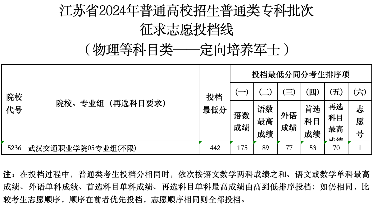 江苏省2024年普通高校招生普通类专科批次征求志愿投档线(定向培养军士)