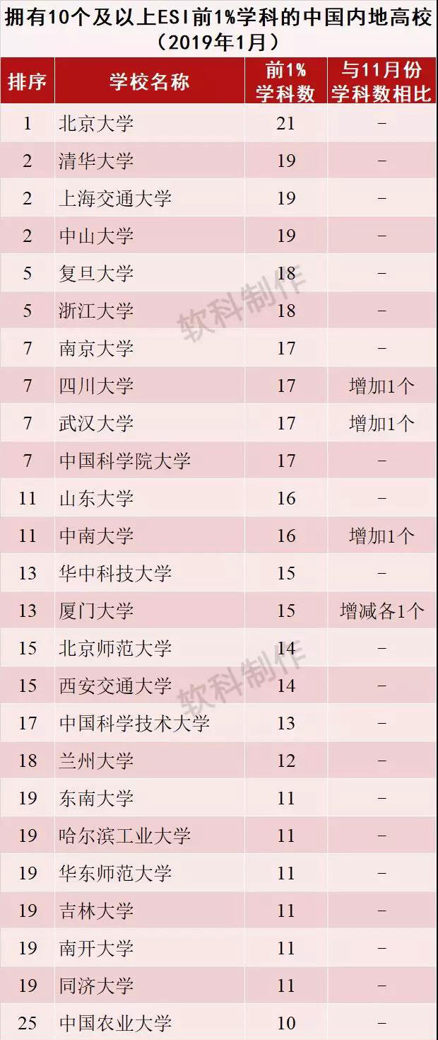 从各大高校的统计结果来看,在本期ESI数据中,拥有10个及以上ESI前1%学科的中国内地高校共有25所,其中武汉大学、四川大学、中南大学各新增1个ESI前1%学科。