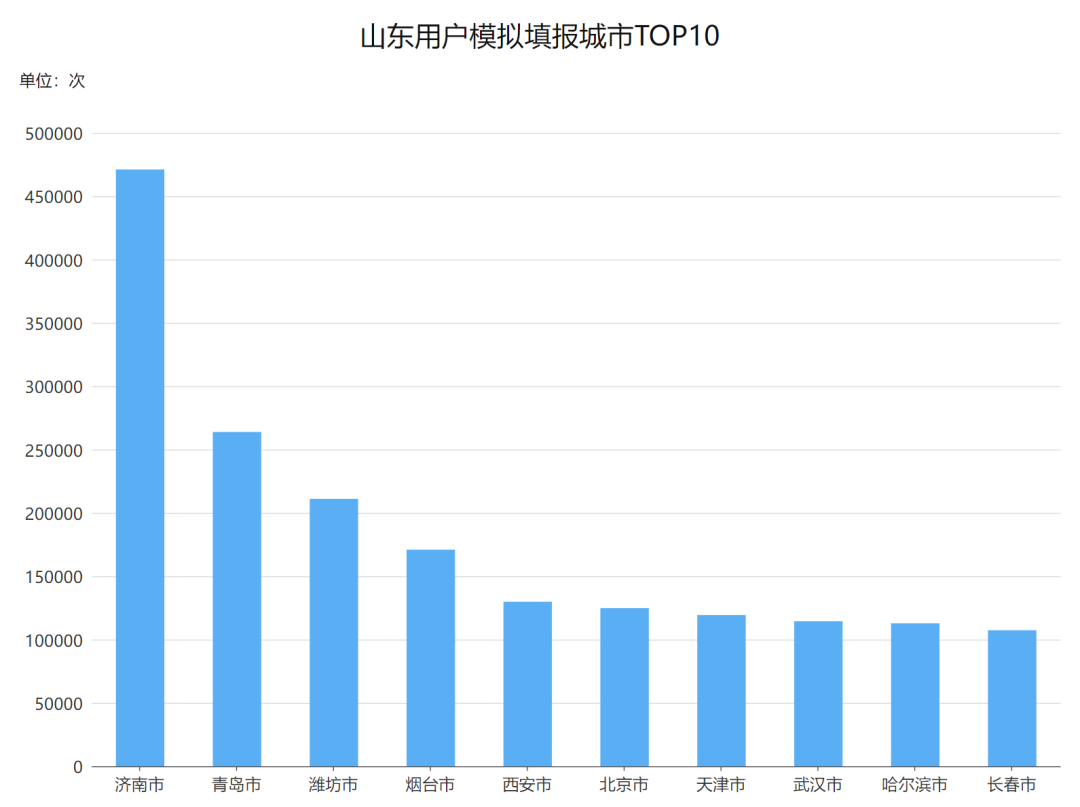 根据用户搜索院校总次数统计,山东用户较为关心本地院校,热搜前十大院校均为山东省内院校。