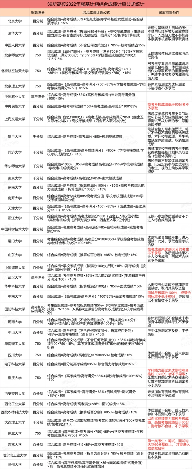高校在招生简章中明确了综合成绩折算办法,2022年39所高校采取的均是85:15的构成比例。