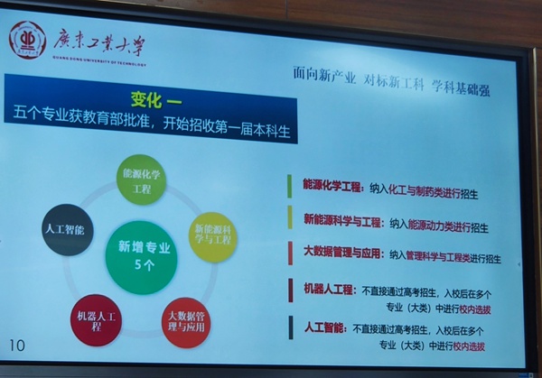 包括:多专业融合新工科培养,如华南地区第一家机器人学院——广工粤港机器人联合学院、集成电路设计联合学院、印制电子电路联合学院等;产教融合校企合作培养,如飞机维修校企班,每年参加3+1校企人才培养的学生600多人;国际联合培养,如2+2国际班、中外合作办学项目。今年特色人才培养还新增了1个多专业融合培养的新工科专业“人工智能”,这个专业的学生将在校内跨学院选拔组班。