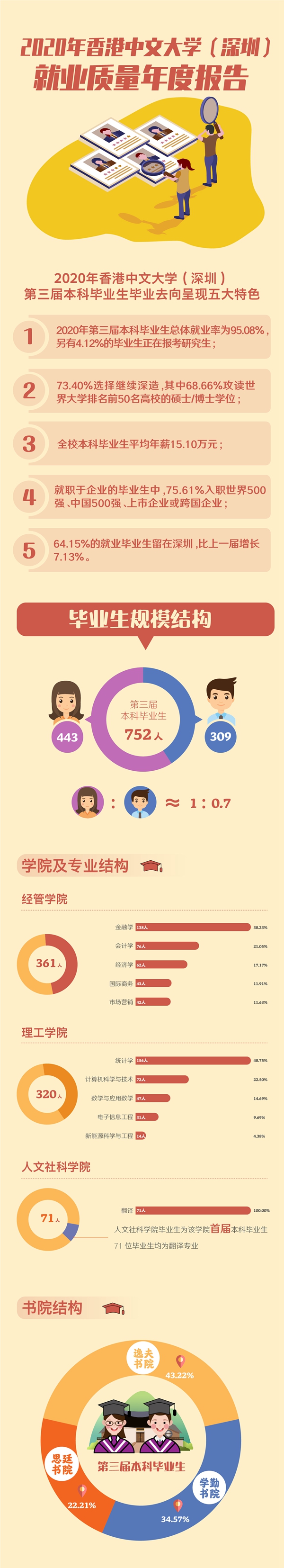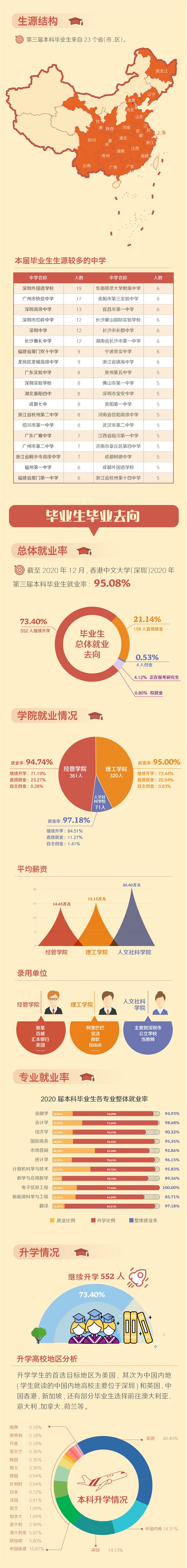 香港中文大学(深圳)本届本科毕业生毕业去向呈现几个特点:总体就业率为95.08%,保持在国内知名高校就业率前列;73.40%毕业生选择继续深造,其中68.66%攻读世界排名前50名的名校硕士/博士学位,升学质量再创新高;全校本科毕业生平均年薪达15.10万元,毕业生就业竞争力保持强劲;就职于企业的毕业生中,75.61%入职世界500强、中国500强、上市企业或跨国企业,学生培养质量得到企业广泛认可;64.15%的就业毕业生留在深圳,比上一届大幅增长7.13%,港中大(深圳)学子更加积极投入到深圳“双区”建设中。