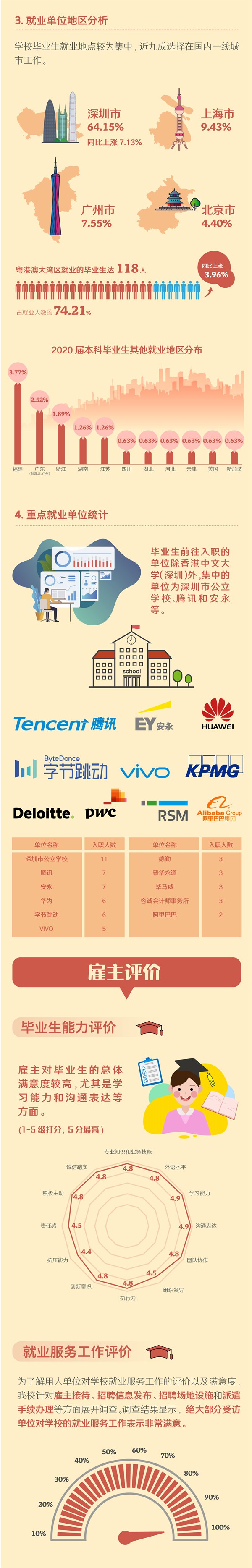 本届本科毕业生的就业单位中,民营企业占35.85%,如华为、字节跳动;三资企业占27.67%,如百威、宝洁、四大会计师事务所;国有企业占13.84%,如建信金科、南方电网、华润三九;另有22.64%毕业生受聘于政府机构/事业单位/科研等机构,比上一届增长11.90%。