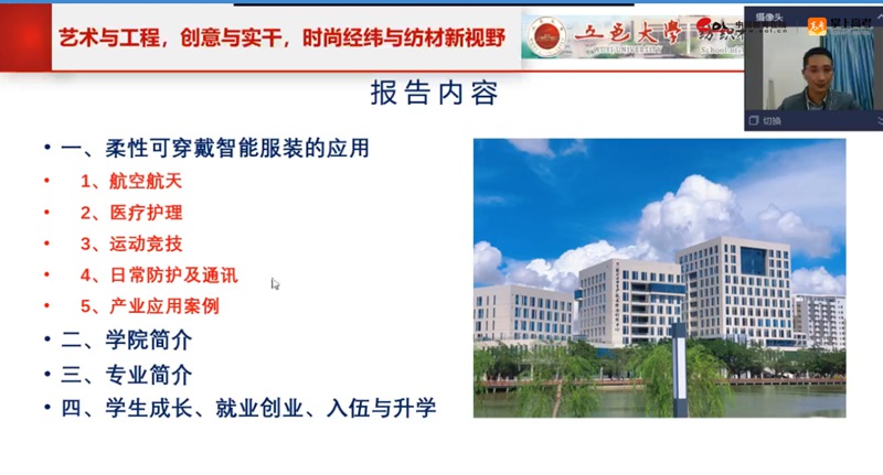 “哇,纺织工程还有那么多应用方向啊!”1月14日晚7:30,金宝搏188入口 2022年主办“广东好大学进高中”五邑大学&广州第六十五中学相约“云端”,直播间热闹非凡。五邑大学纺织工程学院副院长、博士、副教授、硕士生导师巫莹柱进行了柔性可穿戴智能服装最新进展及学校纺织工程专业简介两方面介绍,广州第六十五中学高一高二学生家长以及闻讯而来的其他学校的学生家长共计3000余人次参加了直播讲座。