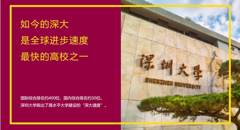 深圳大学建校于1983年,是深圳特区首所高等学府,由北大、清华、人大等国内名校倾力援建。建校39年来,深大紧随特区,锐意改革、快速发展,在较短的时间内形成了本硕博的完整人才培养体系,创新创业人才培养等领域的改革走在全国前列,已经成为一所特色鲜明、实力雄厚、在国内外具有良好声誉和重要影响力的高水平综合性大学。