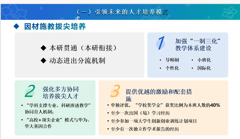 华工引领未来的人才培养模式:百步梯创新学院(计算机全英创新班等双学位试点项目:软件工程+工商管理 金融+计算机等)、新工科人才培养示范区(智能制造工程、人工智能等)、卓越工程师计划(软件工程卓越班等)、“强基计划”班(数学类、化学类、生物技术)、基因组创新班(基因组创新班共有112人次以并列第一作 者和署名作者身份在Nature、Science等顶 尖学术期刊发表论文92篇,被誉为“本科人 才培养的奇迹”“一场静悄悄的教育革命”)。