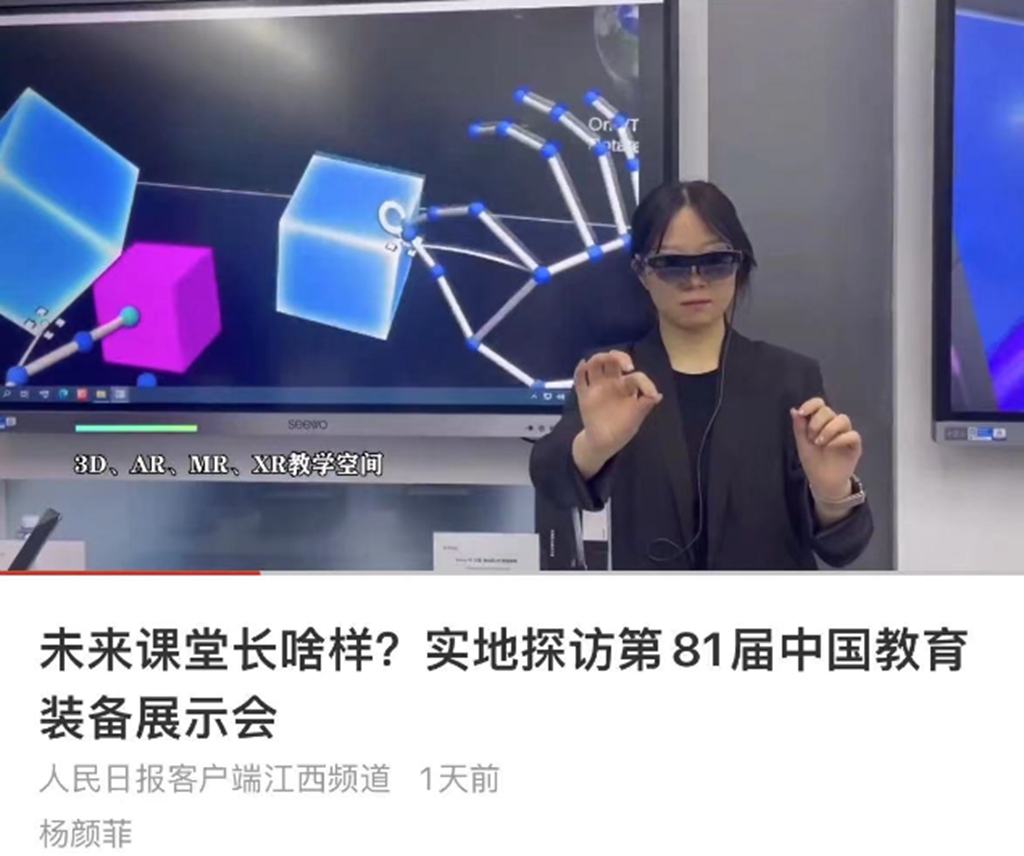 人民日报客户端江西频道的记者前往展会现场,对参展企业进行报道,并采访了相关企业负责人,探讨教育数字化发展趋势。希沃桌面VR交互一体机、希沃智慧黑板、希沃智能讲台、希沃数字孪生校园等产品得到了人民日报的关注。