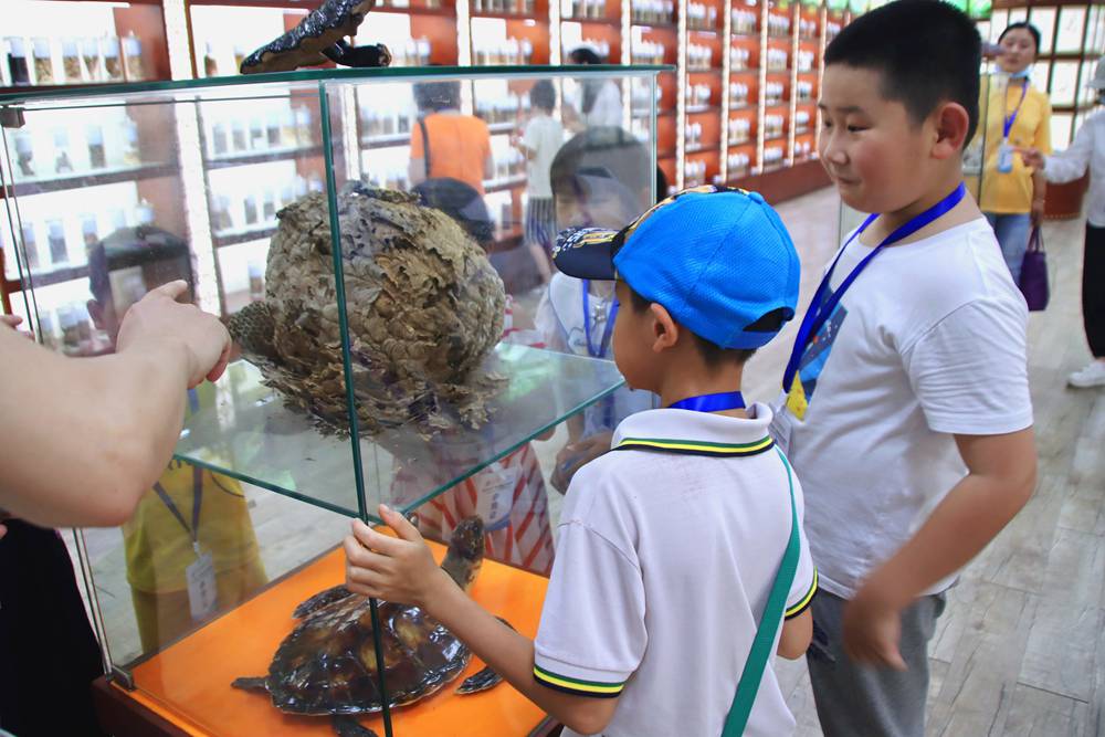 随后,科普讲解员带领学生们来到中药标本馆,引导他们实地观察认识常见中药材。我校中药标本馆素有“华商中药百科全书”的美誉,总占地面积400㎡,馆内有生药标本500余种,其余标本上千种,既是我校中药标本的示范地,又是师生们的教学课堂和科研基地。