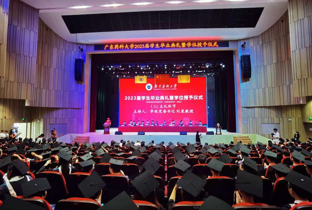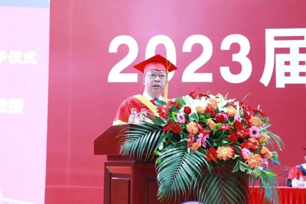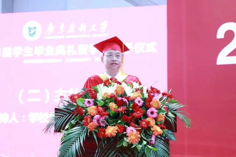 典礼在庄严的国歌声中拉开序幕。学校党委副书记、校长翟理祥以《以理想和奋斗之光照亮再出发之路》为题深情致辞,向圆满完成学业即将逐梦远航的毕业生们送上热烈的祝贺与真挚的祝福。他指出,2023届毕业生身处最好的时代,见证了全面建成小康社会、中国共产党成立100周年、中国共青团成立100周年、全面建成中国空间站、北京冬奥会顺利举办、党的二十大胜利召开、全国两会选举产生新一届国家机构领导人等诸多盛世荣光,共同参与和推动学校高质量发展,奋进新征程取得优异成绩。他赞许毕业生们经受了严格的思想淬炼、政治历练、实践锻炼、专业训练,交出了既出彩又满意的毕业答卷,刷新了广药大人的自信自强,书写出“强国有我”的青春华章。离别之际,翟理祥以一剂“四不”强心励志方为广大毕业生开启新征程助力赋能。“不忘初心有理想”,要把个人的理想追求融入党和国家事业之中,融入健康中国建设之中,始终保持心中有理想、眼中有远方,以实现中华民族伟大复兴为己任,不负韶华、一路前行;“不惧未来敢担当”,要坚守“为祖国医药卫生事业的发展和人类身心健康奋斗终生”的庄严承诺,践行“人民至上、生命至上”的价值理念,弘扬伟大抗疫精神和敢为人先的创新精神,彰显未来医药行业生力军的责任与担当;“不言放弃能吃苦”,无论在经济建设主战场、科技创新最前沿、社会建设新领域,还是基层实践大舞台,都要有不怕苦、能吃苦的意志力,需要在对的路上不言放弃;“不失时机肯奋斗”,新时代新征程赋予我们更多的机会,新时代是奋斗者的时代。广大毕业生要坚持内外兼修,矢志奋斗,书写无愧于时代的青春之歌和精彩人生。
