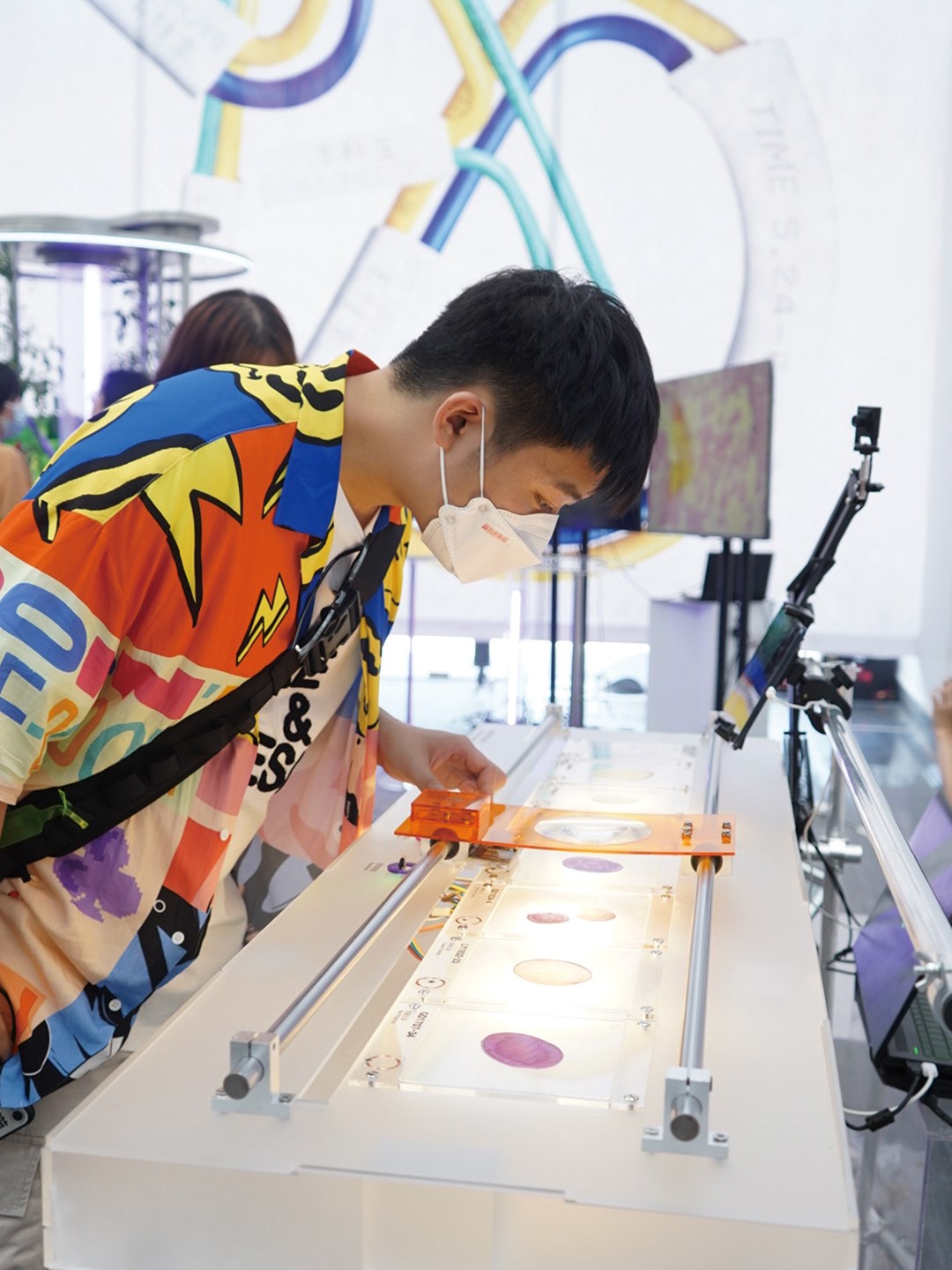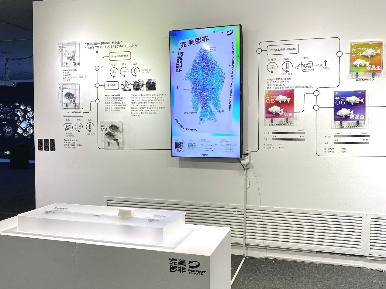 此外,毕业展中还呈现了《完美罗非鱼》《壳生新境》《彩色土豆》等作品。《完美罗非鱼》让观众可以通过移动调控台面滑块来探索罗非鱼口味的变化。《壳生新境》通过研磨大湾区各类海鲜废弃壳,并对1200 份以上海鲜废弃壳配比的研究和10轮的迭代筛选,将海鲜废弃壳制造成一种环保复合材料。《彩色土豆》通过信息交互装置,对不同性别和年龄的人进行脸识别,根据观众个体的营养需求匹配不同品种的彩色土豆饮食方案。