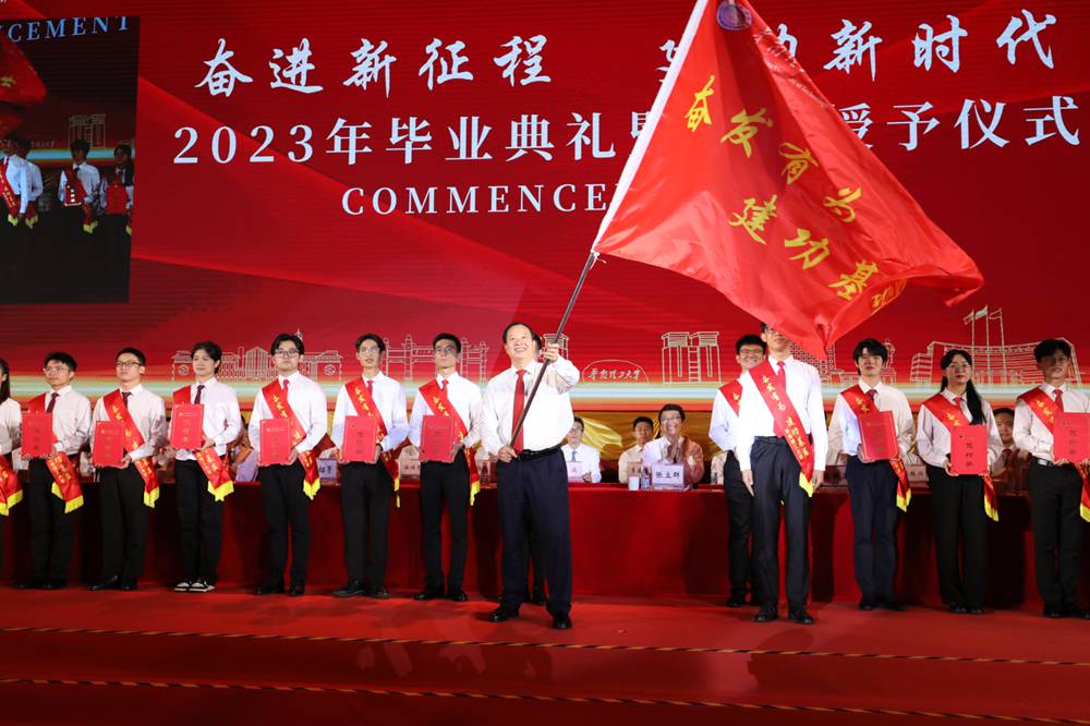 张立群在致辞中点赞多位2023届优秀毕业生,获得了现场学生的阵阵掌声。他向所有毕业生提出期望,“生逢盛世,这是属于你们的时与势;广阔舞台,这是赋予你们的担与责。新征程是充满光荣和梦想的远征,也是充满激流和险滩的航程,你们自当踔厉奋发、笃行不怠,成长在祖国的需要里,奋斗在人类的进步中。”