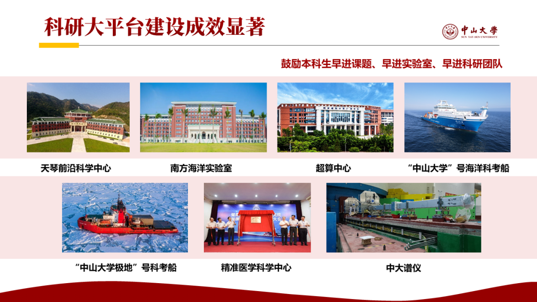 中山大学鼓励本科生早进课题、早进实验室、早进科研团队。国家、省部以及学校的各类科研平台,包括国家高端智库、天琴中心、海洋综合科考实习船、极地破冰多用途船、精准医学科学中心、国家超级计算广州中心等都对本科生开放,强化学生实践创新能力培养。