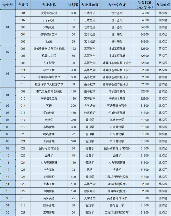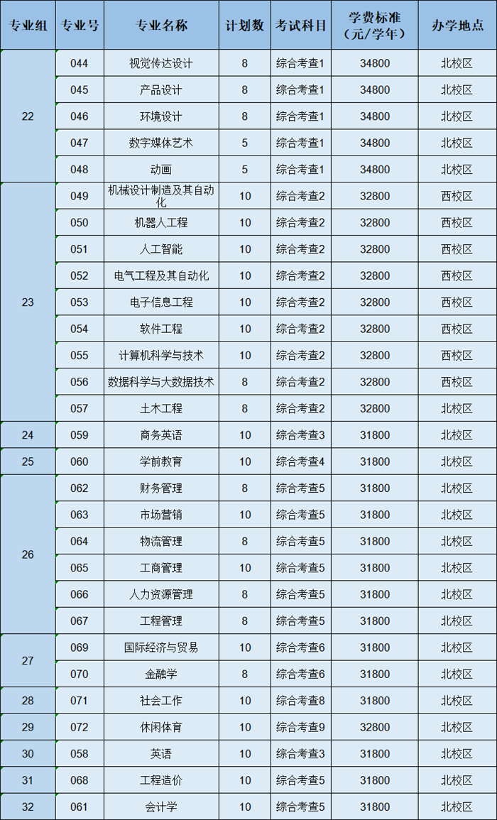 4.退役士兵批次专业组23仅招工学类专业专科学生,专业组22仅招收艺术设计类专业专科学生,且不招收色盲考生;学前教育、休闲体育、工程造价、会计学、商务英语专业的前置专业要求与普通类专升本专业一致;