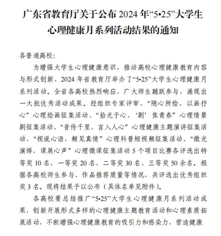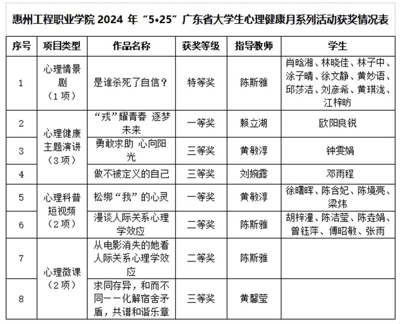 近日,广东省教育厅公布了2024年“5.25”大学生心理健康教育月系列活动评选结果,惠州工程职业学院师生作品在活动评选中取得优异成绩,荣获特等奖1项、一等奖2项、二等奖2项、三等奖3项,在获奖等级、数量和项目类型上,实现了多个突破。