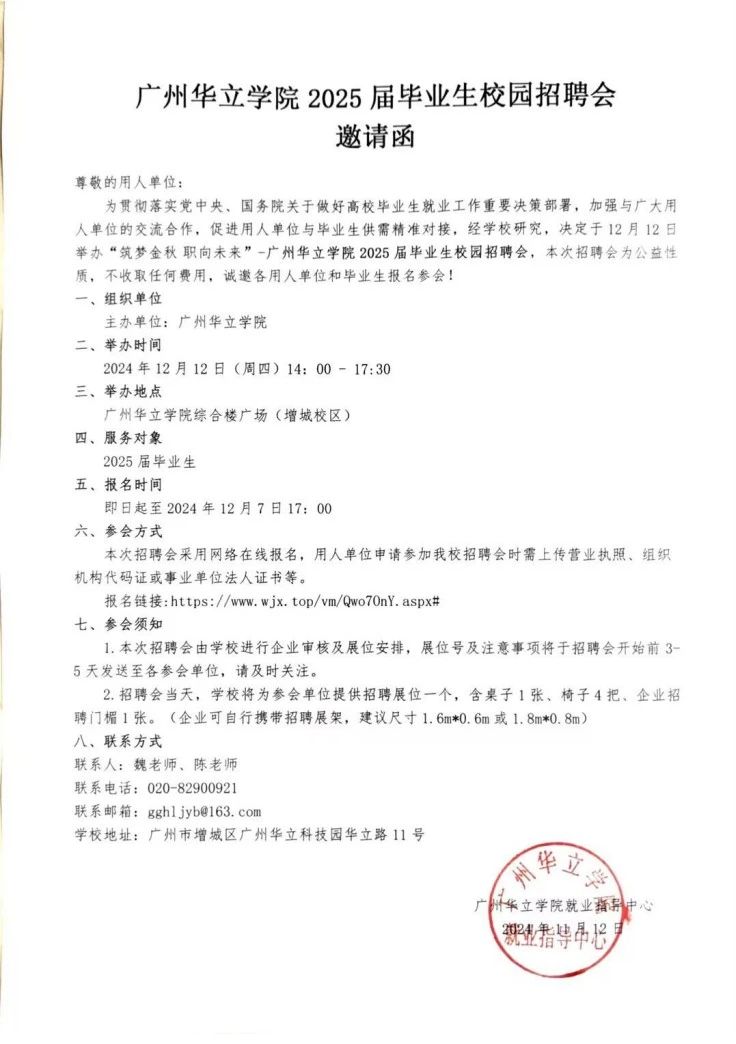 衷心感谢贵单位对我校毕业生就业工作的大力支持!为加强交流合作,促进用人单位与毕业生供需精准对接,我校决定于12月12日举办“筑梦金秋 职向未来”-广州华立学院2025届毕业生招聘会,本次招聘会为公益性质,不收取任何费用。现诚挚邀请贵单位莅临我校选聘优秀毕业生,我们将以专业的精神为您提供最优质的服务!有关事项通知如下: