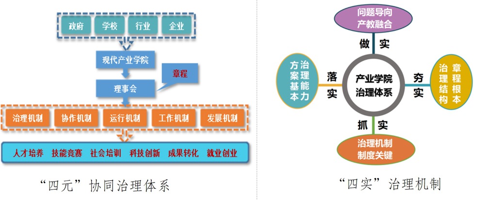 实化“四元四实”,构建多元协同治理格局。学校主动融入产业园区,建设现代产业学院。构建由政府、产业园区、专精特新企业和高职院校“四元”组成的产业学院理事会。以问题为导向做实产教融合,以章程为根本夯实治理结构,以制度为关键抓实治理机制,以方案为基本落实治理能力,创设“四实”治理机制,构建产业学院治理机制,形成校企治理体系,实现校企共建共享资源,共培共育学生,营造共建共治共享生态。同时聚焦国家重点战略布局,主动围绕南沙产业发展,建设南沙职教集团,积极构建混合式“三引三性”(引孵产业、引培企业、引育学生,园区社会性、企业经济性、学校公益性)现代产业学院治理体系,实施现场工程师改革和中国特色现代学徒制改革,共建南沙产教融合国家示范区,构建广州职业教育向南的“增长极”。