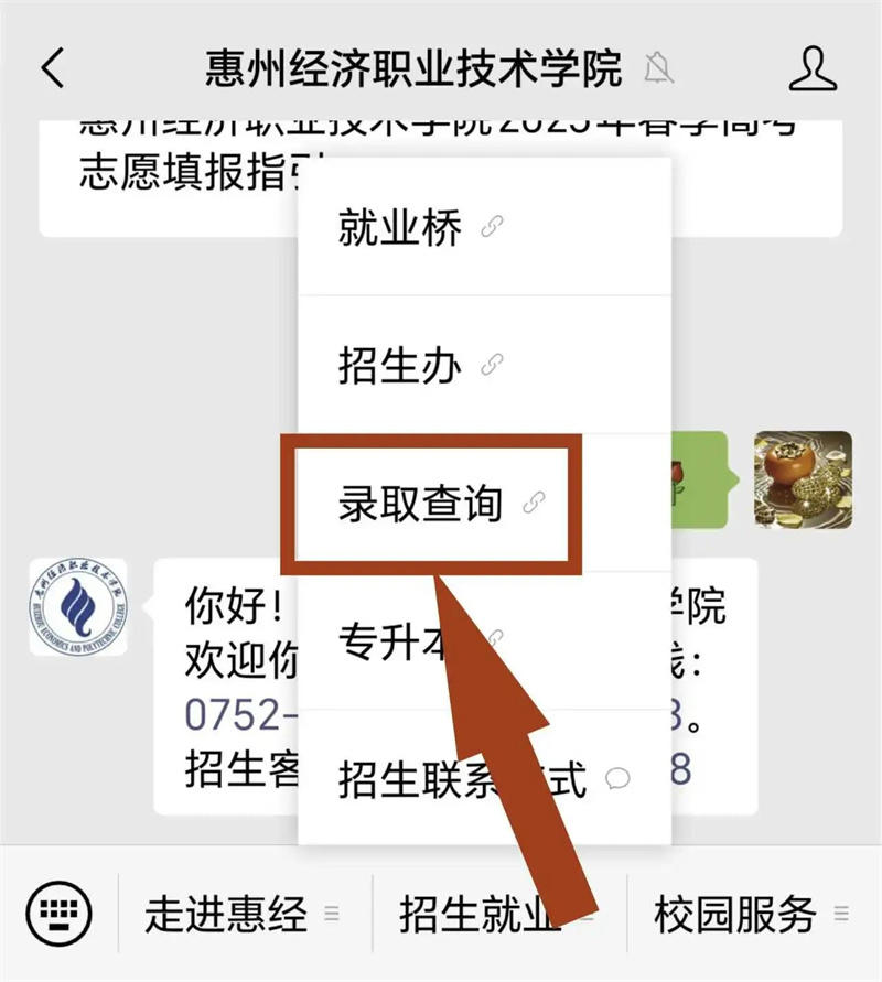 03关注“惠州经济职业技术学院”公众号,点击菜单栏“招生就业”进行查询