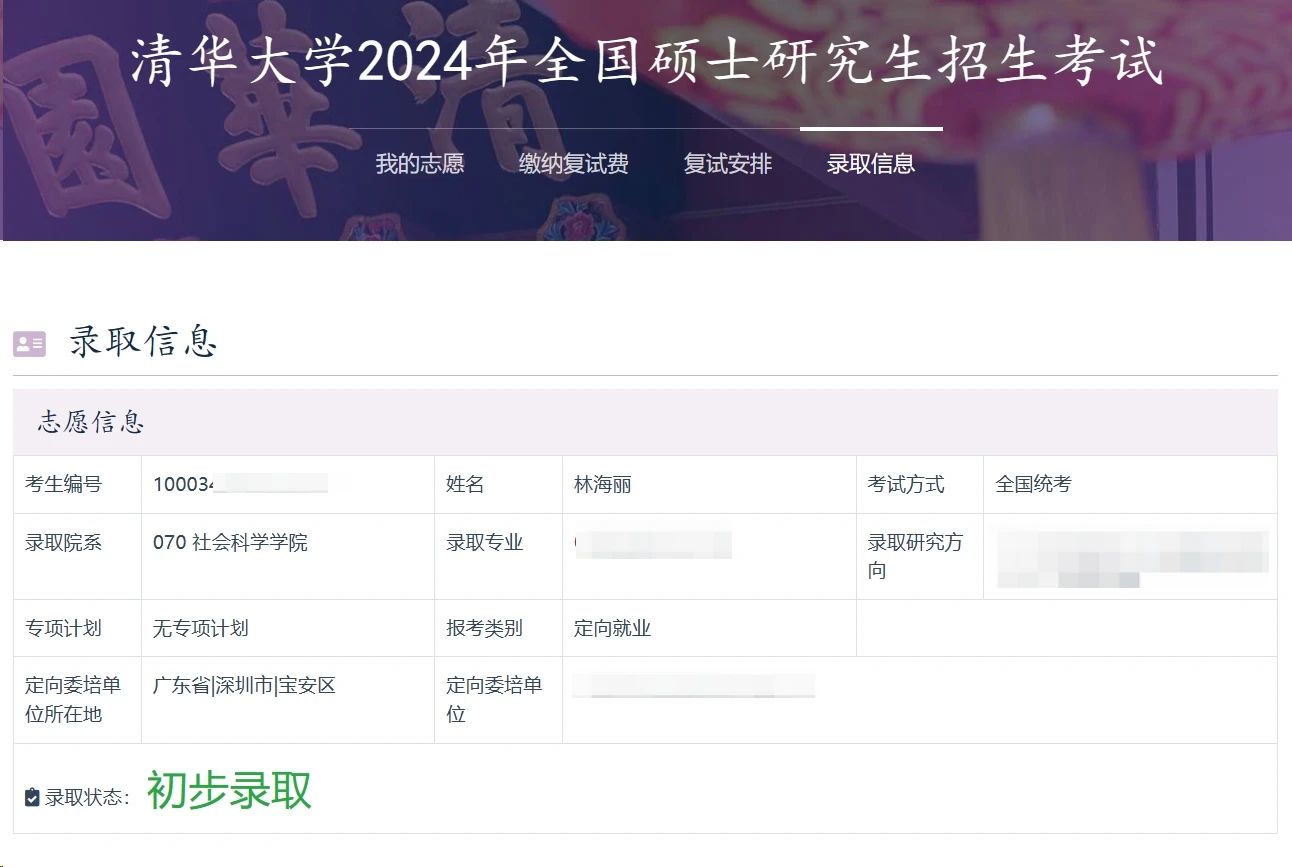 ▲清华大学初步录取林海丽