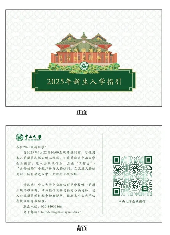 中山大学企业微信群是学校唯一的新生联络咨询群,请勿轻信其他途径的各类通知。详情请见录取通知书中放置的卡片(如下图)