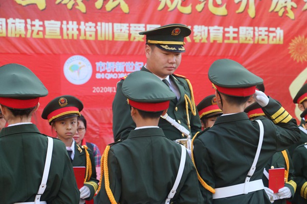 教官代表全国学校升旗手总教官向学校国旗护卫队队员颁发培训证。队员们踏着铿锵有力的正步,昂首挺胸、气宇轩昂地迈向领奖台,队员们领导证书后,教官带领着大家一起宣誓!队员们用响亮的声音,坚定地眼神告诉我们,他们一定会成为一名光荣的升旗手,共同维护国旗的荣誉!