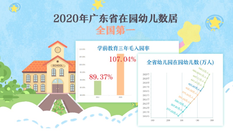 2011年以来启动了三期“广东省发展学前教育行动计划”,2020年和2021年连续两年将幼儿园普惠性学位建设列入省十件民生实事之首,积极构建广覆盖、保基本、有质量的学前教育公共服务体系。从广东省学前教育十年发展“大数据”中,我们追寻到学前教育发展“腾飞”的轨迹。