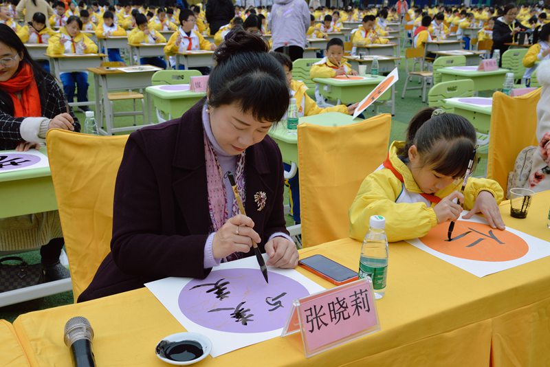 竹料三小的李婧君同学在开幕式上介绍了学校的书法发展特色,同时也和大家分享了自己的书法学习心得。白云区第一批书法进校园书法家代表涂梅钗老师分享了近两年开展书法公益授课、组织师资培训所取得的优异成果。随后领导嘉宾与黄边小学全体师生、20所“书法进校园”学校师生代表1200余人,通过书法现场挥毫、经典诗文诵读的方式,共同感受中国传统优秀文化的魅力。