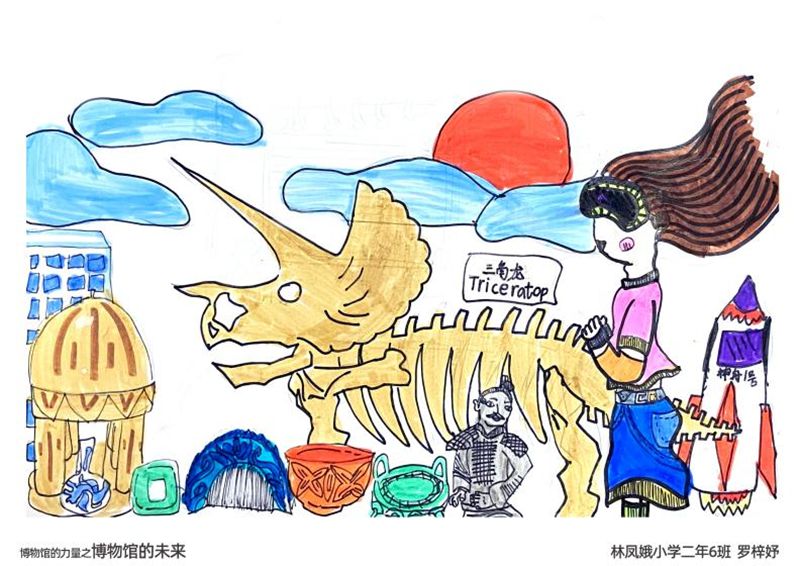 广州市荔湾区林凤娥小学二年级的罗梓妤同学用了三幅系列绘画作品来表现博物馆的力量,其中博物馆神奇的力量,让她可以和几亿年前的恐龙一起合影!
