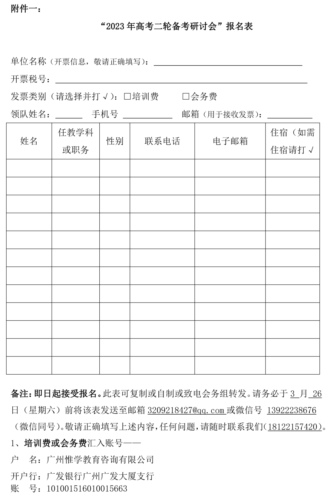 即日起接受报名。请于2023年3月26前,将《报名表》(附件一)及缴费回执(拍照或扫描)发送至会务组邮箱:3209218427@qq.com,即完成报名。邮件主题请注明:高考二轮备考。会务组收到邮件,当即时回复。