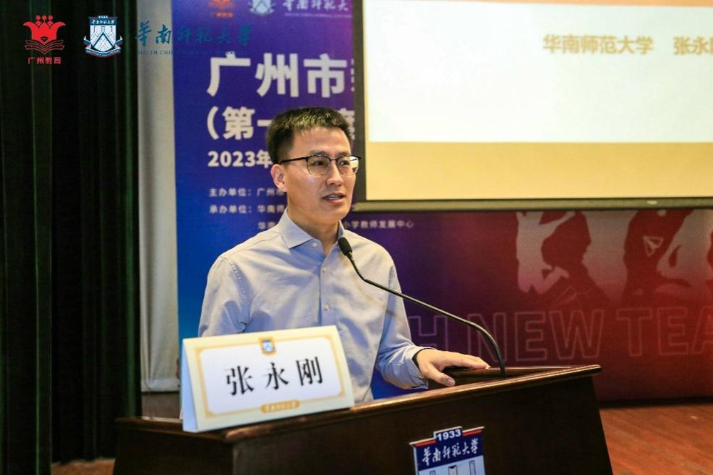 开班仪式后,华南师范大学马克思主义学院张永刚教授为新教师作《以立德树人铸就教育之魂——深入学习习近平总书记关于教育的重要论述》专题讲座。他从“为什么——关乎国之大者”、“做什么——教育立德树人”、“怎样做——立足关键课程”、“要做好——争做大先生”和“做得好——筑牢教学质量生命线” 循序渐进等五大板块向新教师阐述如何将习近平总书记关于教育的重要论述科学灵活地应用到教育教学工作中,指导教育实践、落实立德树人根本任务。他呼吁新教师们要有大境界、大爱和大智慧,有端正乃至热爱的态度,坚持问题主导的教学理念,运用“理论叙事”的内容呈现,利用丰富多元的教学要素,建立互为信任的师生关系,潜心教学,构建课程育人模式。他的思政课富有方向性、感染力和吸引力,成为新教师如何上好思政课、如何开展课程思政,实现全员、全方位、全过程育人的示范引领。