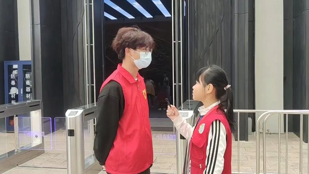现场还有不少的志愿者,我采访了一位来自广州铁路职业技术学院的大哥哥,问他为什么要来当志愿者?大哥哥笑着对我说:“做志愿者是一件可以帮助他人和体现自己价值的事,还可以帮助到一些不方便使用手机的老人家登记入馆参观。”