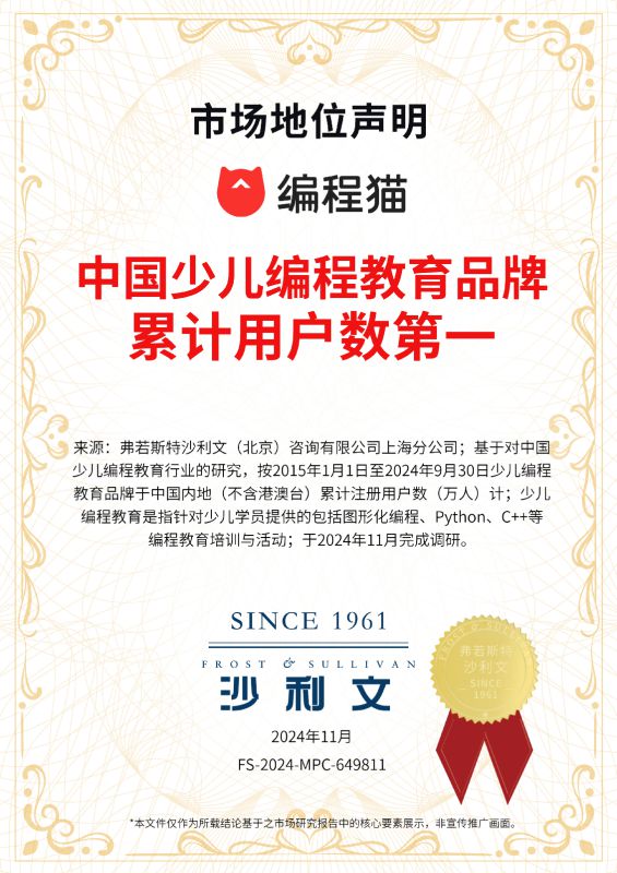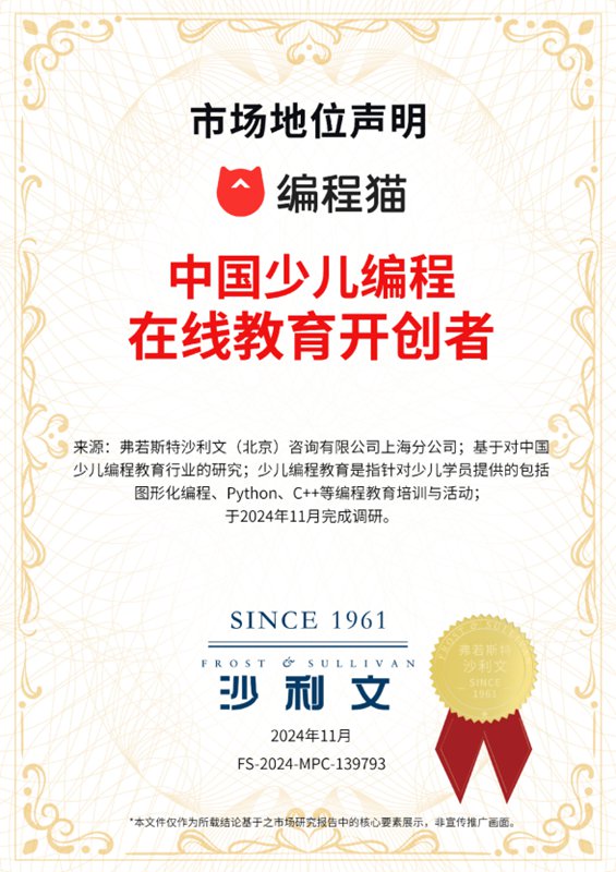 近日,全球顶尖研究及咨询机构弗若斯特沙利文(Frost & Sullivan)授予编程猫“中国少儿编程在线教育开创者”“中国少儿编程教育品牌累计用户数第一”“中国少儿编程教育编程软件累计使用人数第一”三项市场地位声明书。