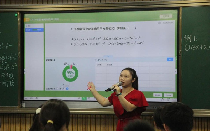 番禺区南村镇侨联中学王雅湄老师和广东华侨中学林毅老师展示八年级数学同课异构课例《平方差公式》。两位老师借助智慧学习卡及平台,数字技术深入融通学科教学精准呈现学生数据,深挖学生问题,实现教学评一体化和课堂增值性评价的目标。