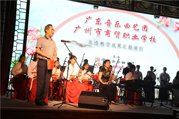 讯6月21日,由广东音乐曲艺团有限公司、广州市商贸职业学校联合主办的 “非遗”项目进校园教学成果汇报演出,在彩虹曲苑徐徐拉开帷幕,广东音乐曲艺团艺术指导、粤语相声表演艺术家黄俊英、国家级非物质文化遗产代表性项目传承人高胡演奏家何克宁、广州市教育局职业与成人教育处副处长吴松海、体艺卫处科长蔡恭良、广东省非物质文化遗产促进会副会长汪凡、商贸学校师生等观看了表演。