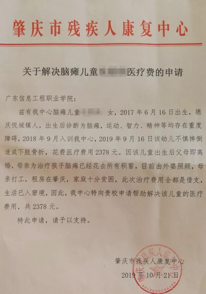 9月16日,肇庆市残疾人康复中心的一名脑瘫儿童不慎摔倒造成下肢骨折,在我们常人看起来不算多治疗费用,却使这个本来为治疗孩子脑瘫已经花去这个单亲家庭所有积蓄雪上加霜。从市残疾人康复中心得知这一情况后,学院及时伸出了援助之手,帮助该儿童解决了全部医疗费用,用实际行动践行学院的社会责任,让这些折翼的天使们感受到更多来自社会各方的关爱。