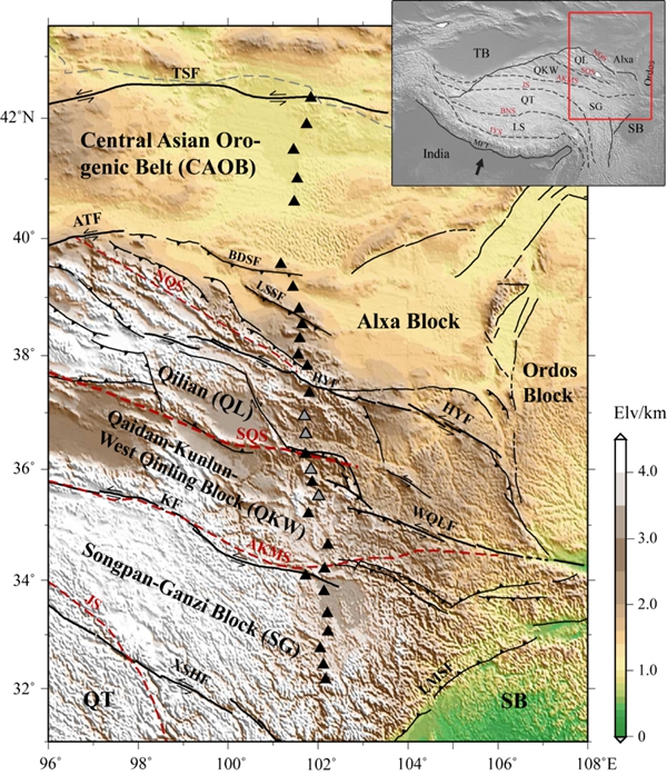 图1. 青藏高原东北缘地质构造图和地震台站分布