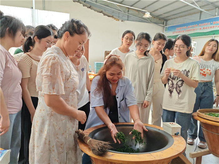 在茶叶加工体验环节,实践团成员进入整洁明亮、茶香四溢的生产车间,开始了从采摘到成品的全过程体验。手工茶是“兴业茶”的一张靓亮名片,在制茶师傅的悉心指导下,学习了如何挑选茶叶、揉捻茶叶以及控制干燥的温度和时间,并亲手参与了茶叶的杀青、揉捻、赋火和干燥等环节,亲身体验了从一片片嫩叶到一杯杯香茗的转变过程。泰国留学生们也决心将这些技艺带回自己的国家,让更多的人了解和学习,为非遗技术的传承与发展贡献自己的力量。