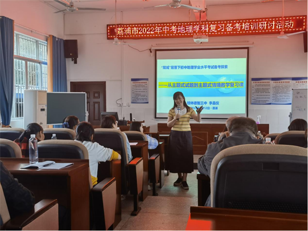 日前,桂林“主题探究式”情境教学成果团队应荔浦市教育局和广西期刊传媒集团的邀请,在“荔浦市2022年中考复习备课研讨活动”初中地理专场中,成果主持人桂林市第三中学的李品仪老师作了题为“双减背景下初中地理学业水平考试的复习备考探索——以主题探究式情境教学复习课为例”的专题讲座。全市的地理教研员和地理教师参加研讨。