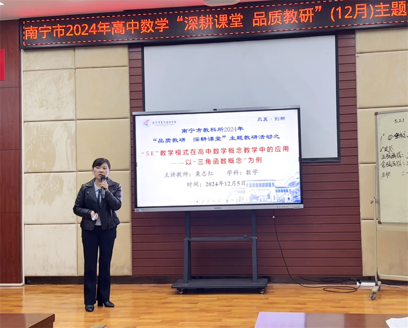 南宁市邕宁高级中学粟志红老师带来了题为《5E教学模式在高中数学概念教学中的应用》的专题讲座。粟老师深入浅出地讲解了5E教学模式的内涵、以“三角函数的概念”为例逐步演示了三新背景下5E教学模式在数学概念教学中的实际应用,为与会教师提供了宝贵的教学经验和启示。