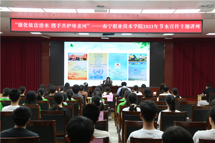 3月23日下午,南宁职业技术学院邀请广西水资源管理中心工程师董建凡,分别从水资源的“多”与“少”、公民节水行为规范与节水宣传等五个方面进行“水日”“水周”话节水知识宣讲。此外,“节水中国 你我同行”节水知识线上、线下有奖竞答活动和环校骑行活动如火如荼地进行,学校还发布《公民节约用水行为规范》、《节约用水倡议书》,广大师生在校内外开展水法政策宣讲、巡河清洁等活动。
