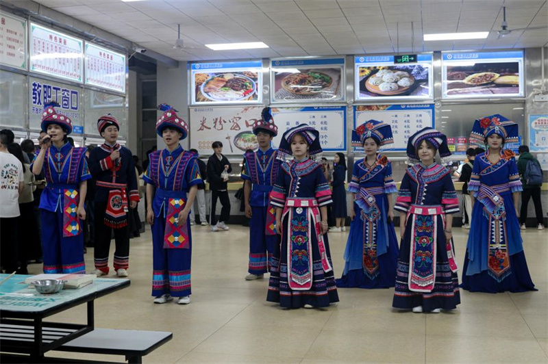 过去,人们在“三月三”期间云集在山头田野或竹林草坡上,用竹子和布匹搭成歌棚,即兴对唱、舞蹈。如今,时代和创新赋予了传统民歌新的生命力。学校艺术团的同学们在天宫楼表演了歌舞“快闪”,用餐的同学们情不自禁与表演者一同合唱。
