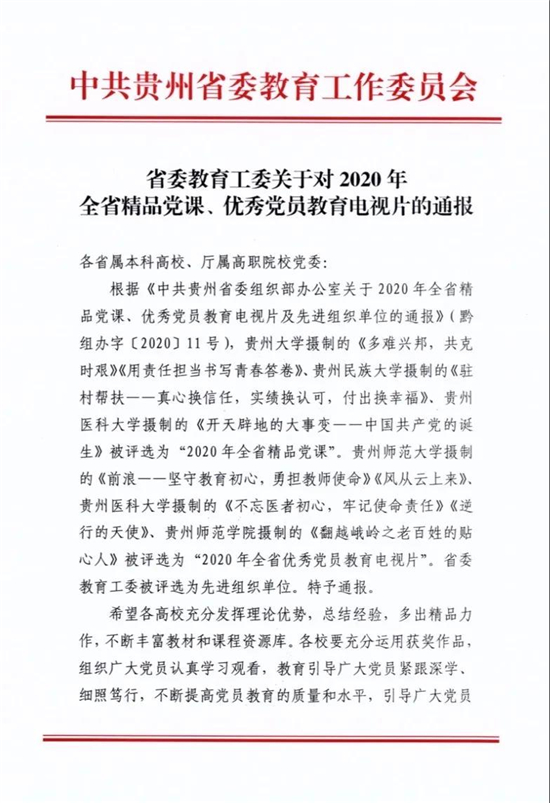 近日,中共贵州省委组织部下发文件,对2020年全省精品党课、优秀党员教育电视片及先进组织单位进行了通报。由贵州医科大学摄制并选送的视频《开天辟地的大事变——中国共产党的诞生》被评为2020年全省精品党课;《不忘医者初心,牢记使命责任》、《逆行的天使》被评为2020年全省优秀党员教育电视片。