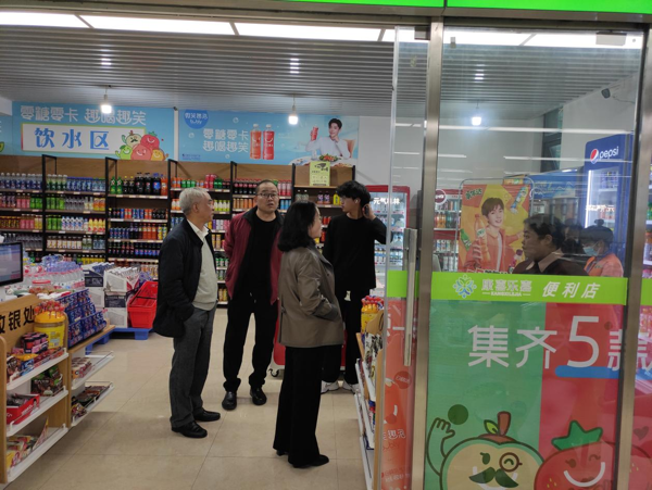 周斯弼、费虹一行从龙山食堂一楼开始,一直到三楼,查看每个就餐档口的菜品种类和价格情况,并亲切和学生交谈,询问学生对食堂饭菜的满意程度。在龙山食堂三楼学生超市,对超市经营者建议,商品价格一定要明码标价,和校外超市价格持平甚至还要略为优惠。