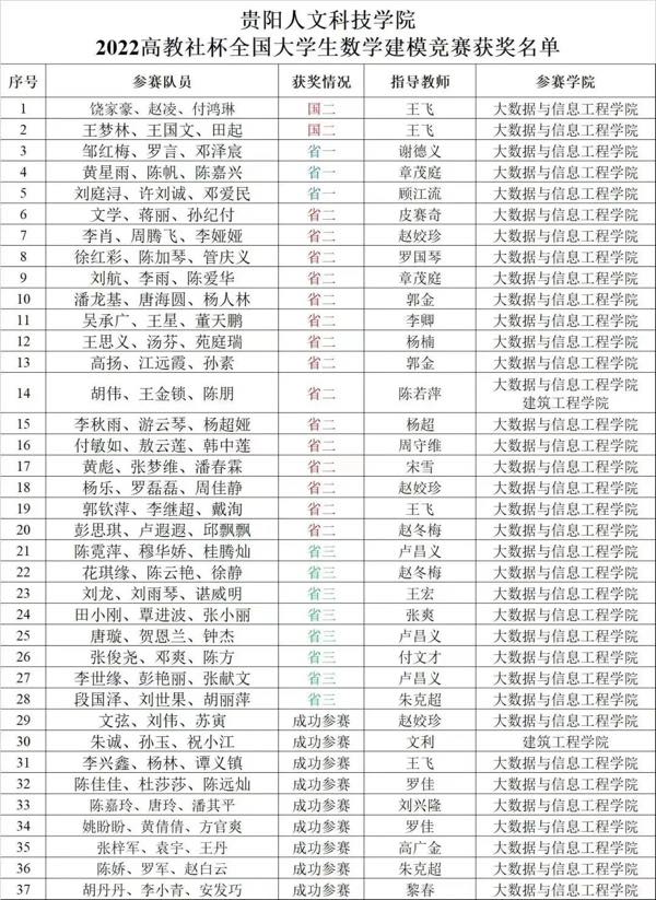 近日,贵阳人文科技学院在2022高教社杯全国大学生数学建模竞赛中荣获:国家二等奖2个、省级一等奖3个、省级二等奖15个、省级三等奖8个。