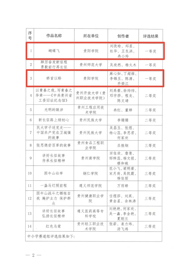 近日,贵州省教育厅组织开展了“薪火黔行故事汇”--讲好长征故事微视频征集活动。此次活动共收到参赛视频116个,其中高校赛道组参赛视频56个,中小学赛道组参赛视频60个。经各市(州)教育局和各高校推荐、专家评选、公示无异议等环节,贵阳学院学子刘孜晗、邱星、杜华、王良洪、冉小玲的作品《蝴蝶飞》荣获一等奖;学子麻心如、丁超维、李锦玉、陈清、乔荣江的作品《桥首以盼》荣获一等奖。