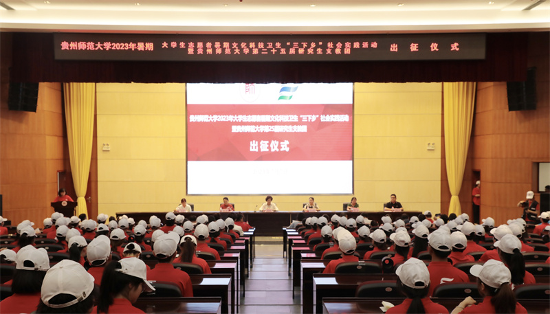 7月7日,贵州师范大学2023年暑期“三下乡”社会实践活动暨贵州师范大学第25届研究生支教团出征仪式在花溪校区会议中心一楼学术报告厅隆重举行。学校党委副书记银熙惠出席出征仪式并讲话。即日起,来自各学院的实践服务队和返家乡的万余名志愿者将奔赴全省各地开展暑期“三下乡”社会实践活动。