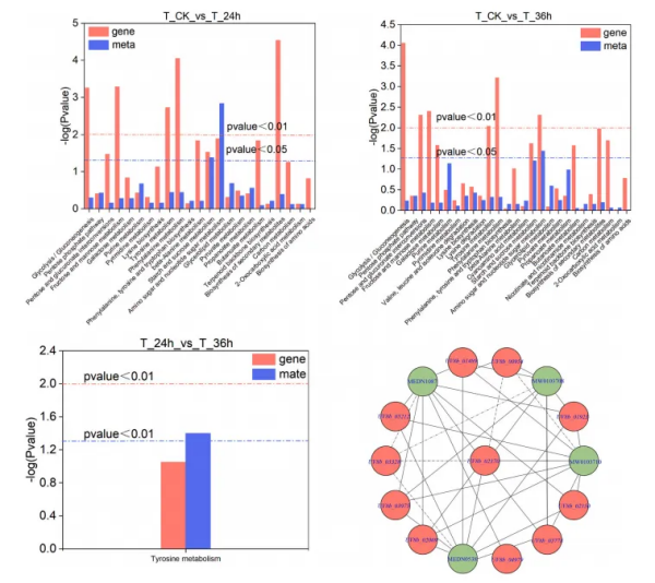 图6.蛇床子素处理后稻曲病菌的差异基因和代谢物KEGG富集和相关性网络图