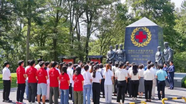 在中国红十字救护总队纪念碑前,全体师生瞻仰先辈纪念碑,默哀鞠躬并敬献花束,以表达对抗战英雄们的深切缅怀和崇高敬意。表示将继续深入学习先辈们艰苦奋斗、救死扶伤、敢于牺牲的精神,铭记抗战历史,汲取精神力量,传承爱国基因!