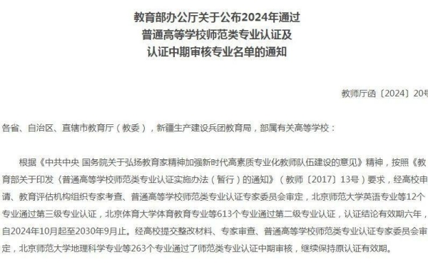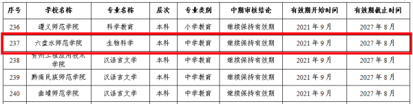 公布了2024年通过普通高等学校师范类专业认证及认证中期审核专业名单,六盘水师范学院生物科学专业顺利通过师范类专业认证中期审核,继续保持原认证有效期。