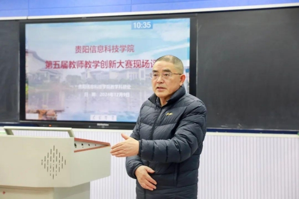 高质量发展,大力弘扬教育家精神,充分发挥教学竞赛在提升教师队伍素质中的示范引领作用,提升教师教书育人能力和人才培养质量,根据《贵阳信息科技学院关于举办第五届教师教学创新大赛校级选拔赛的通知》(教研发〔2024〕96号)安排,近日,学校在E303智慧教室举办第五届教师教学创新大赛校级选拔赛现场评审会。本次活动特邀校外专家许亮教授、张克雯教授、王春晓教授对参赛教师进行现场提问并打分,校长唐建荣,副校长罗卫东出席,教学科研处处长王志康主持。
